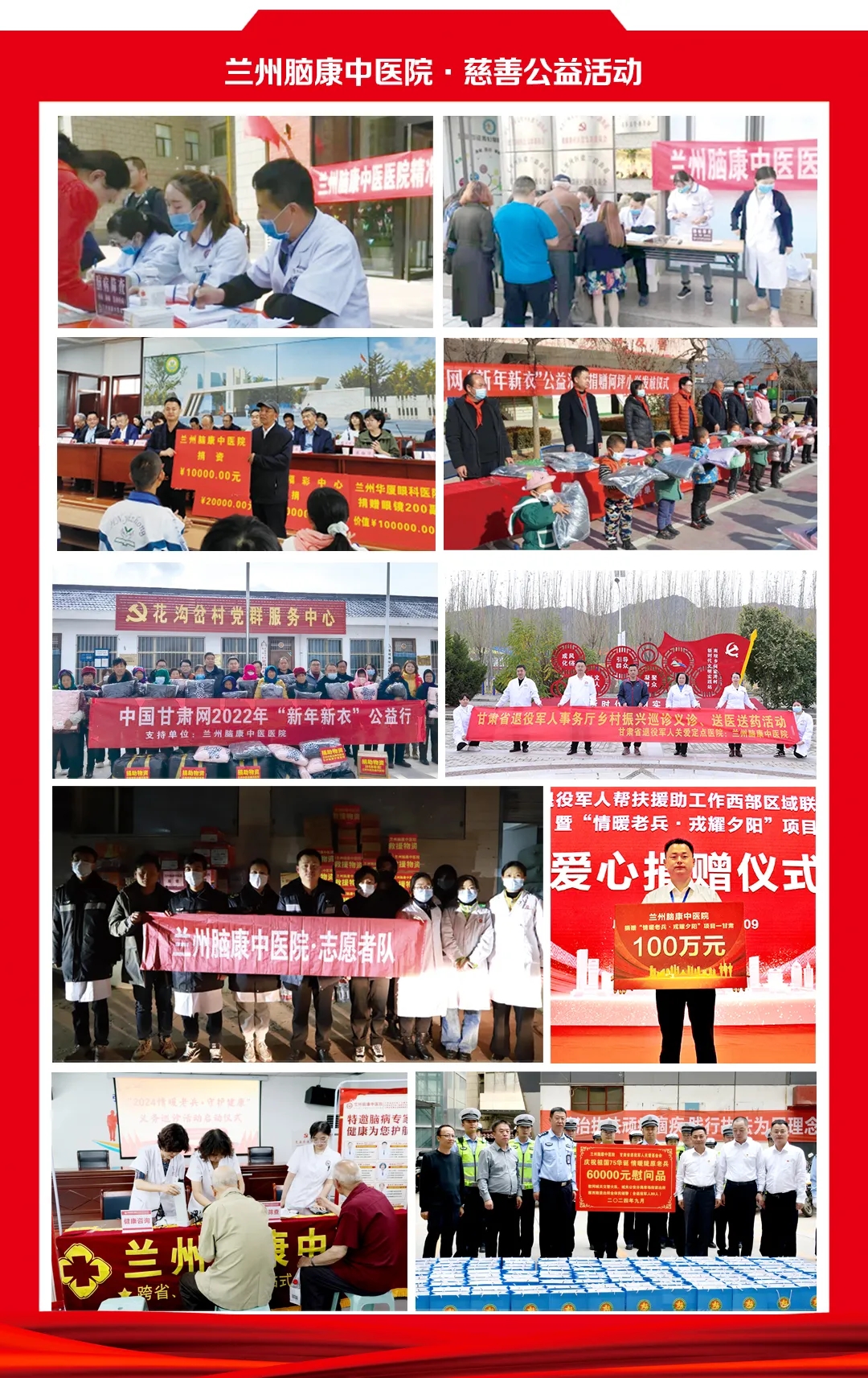 自建院以来,兰州脑康中医院始终坚守“以患者为中心”的服务理念,致力于提升医疗技术水平和服务质量,为患者提供温馨、专业、高效的医疗服务。同时,医院还积极履行社会责任,多次组织医疗团队前往周边地县开展助学助困、扶贫慰问、义诊走基层等公益志愿活动,用实际行动传递着关爱与温暖,赢得了社会各界的广泛赞誉与好评。