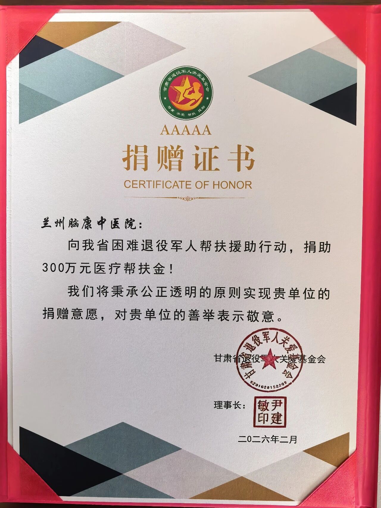 兰州脑康中医院作为甘肃省退役军人关爱基金会定点医院向我省困难退役军人帮扶援助行动,捐助300万元医疗帮扶金(脑病体检卡3000张,每张1000元,连续第三年)。此次捐助的3000张脑病体检卡,将定向发放给我省符合条件的困难退役军人。持卡退役军人可在兰州脑康中医院享受多项针对脑病筛查的专业体检项目,全面了解自身健康状况。医院将为持卡老兵开辟绿色就诊通道,安排经验丰富的医疗团队为其提供细致的检查服务和专业的健康解读,确保每一位受助人员都能享受到便捷、高质量的医疗关怀。这一持续三年的帮扶行动,不仅为困难退役军人的健康保驾护航,也展现了我院以实际行动践行医者担当,传递对老兵的尊崇与关爱。