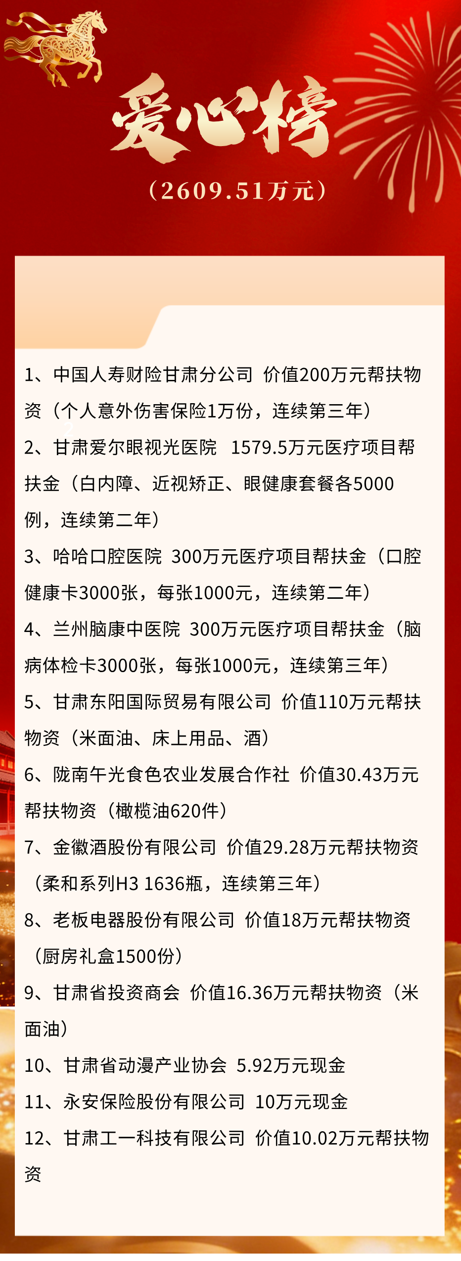 随后各爱心企业开展爱心捐赠仪式。兰州脑康中医院等12家爱心企业向省退役军人关爱基金会捐赠价值2609.51万元帮扶物资,用于困难退役军人帮扶援助。